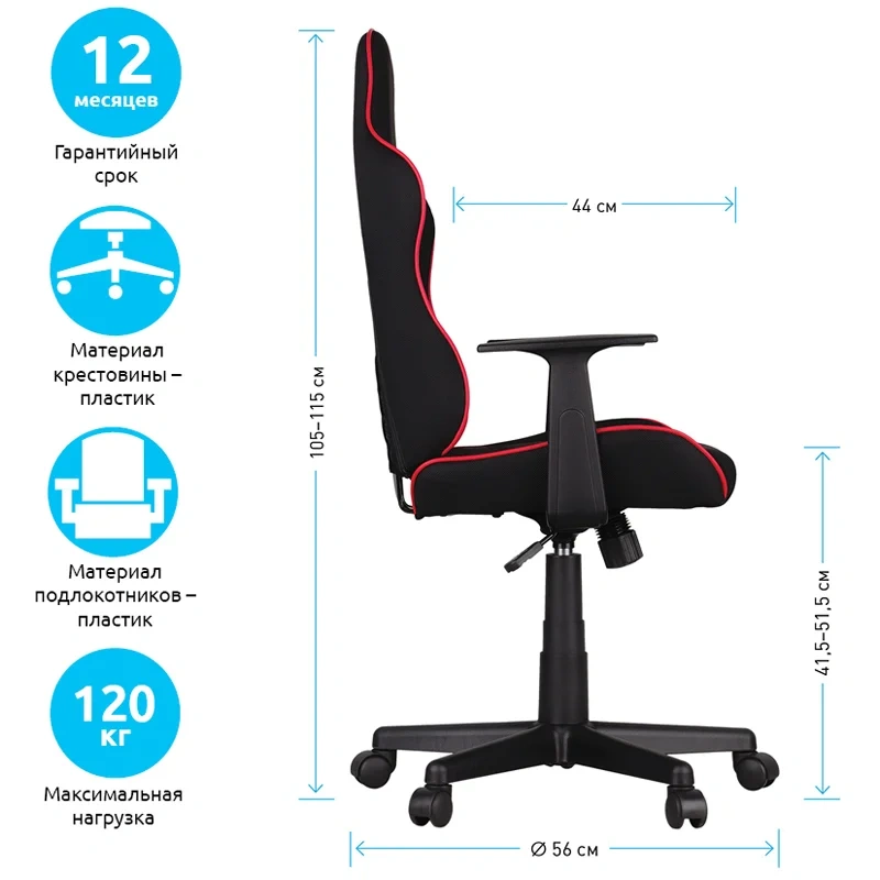 Максимальная нагрузка составляет 120 кг. Газпатрон 3 класса по стандарту BIFMA X5.1. Каркас – немонолитный, материал набивки – вспененный полиуретан, крестовина – пластиковая, подлокотники – пластиковые, материал обивки – ткань чёрного цвета с красными вставками. Механизм качания с возможностью фиксации кресла в рабочем положении. Гарантийный срок – 12 месяцев.