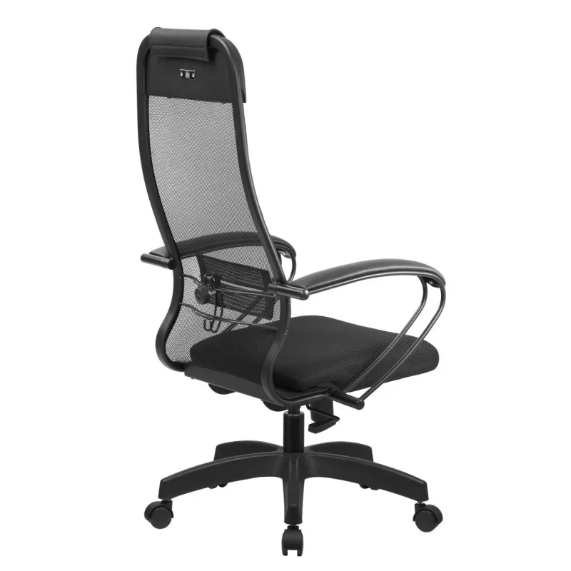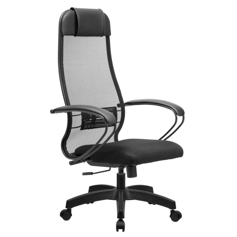 Кресло для руководителя Метта 11 MPRU. Спинка кресла изготовлена из сетки, свободно пропускающей воздух, и имеет накладку-подголовник. Сиденье выполнено из обивочной сетчатой ткани без прошивки. Металлические подлокотники оснащены мягкими накладками из искусственной кожи. Крестовина — пластик. Механизм качания Top Gun — свободное качание с фиксацией в вертикальном положении. Угол между спинкой и сиденьем не меняется. Кресло имеет регулировку по высоте (газлифт). Максимальная статическая нагрузка на кресло — 120 кг.
