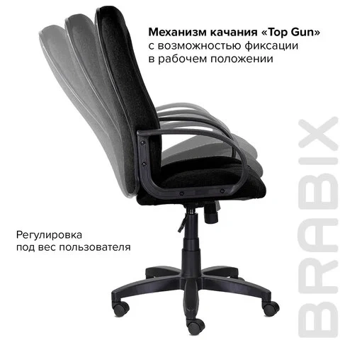 Модель оснащена механизмом качания 'Top-Gun' с регулировкой под вес и возможностью фиксации в рабочем положении.
