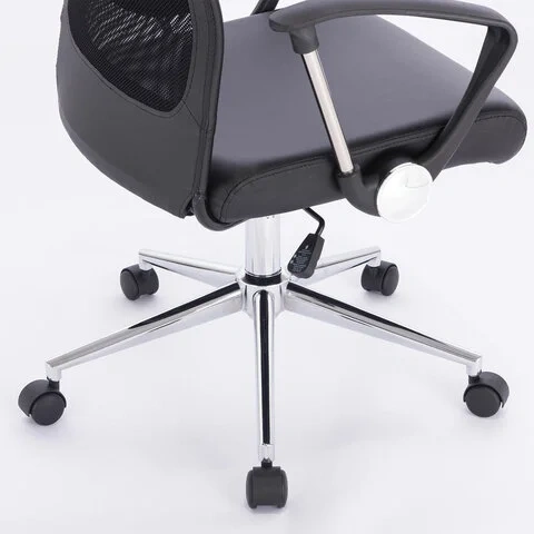 Обивка сиденья выполнена из устойчивой к износу экокожи - современного материала на хлопковой основе, а сетчатая спинка способствует естественной циркуляции воздуха.