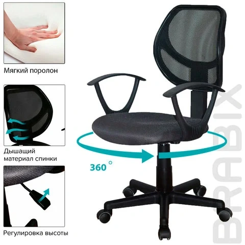 Спинка обтянута плотной акриловой сеткой, которая обеспечивает необходимый комфорт в течение всего рабочего дня. Форма спинки выполнена с учетом эргономики.