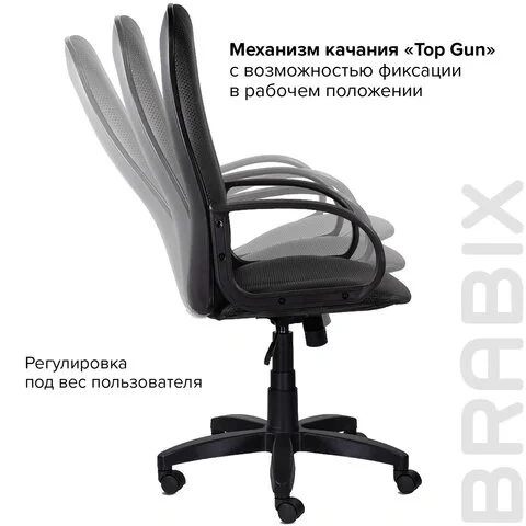 Модель оснащена механизмом качания 'Top-Gun' с регулировкой под вес и возможностью фиксации в рабочем положении.