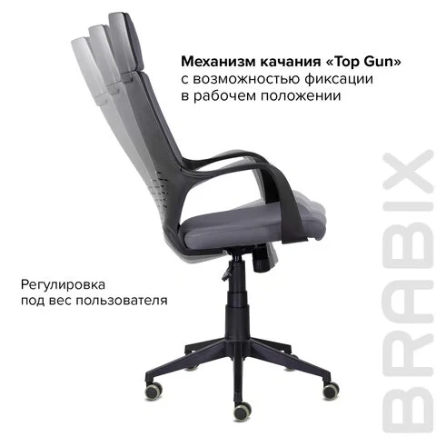 Надежный механизм 'Top Gun' гарантирует хорошую поддержку спины и комфорт за счет возможности свободного качания с фиксацией в одном рабочем положении и регулировкой усилия качания под вес сидящего, позволяет регулировать высоту сиденья.