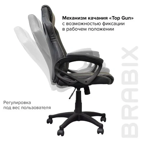 Кресло оснащено механизмом качания «топ-ган» с регулировкой под вес пользователя и возможностью фиксации в рабочем положении.