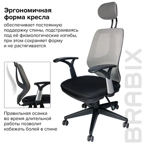 Спинка кресла выполнена из прочного сетчатого акрила. Материал обладает высокой воздухопроницаемостью, легко чистится, способен подстраиваться под физиологические изгибы спины, при этом сохраняет форму и не растягивается. Залогом комфортного использования кресла также является эргономичная форма надёжного пластикового каркаса.
