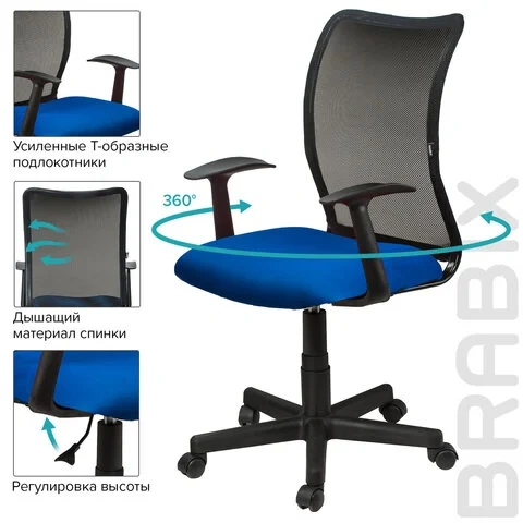 Кресло офисное Brabix Spring MG-307 сетка, черная, ткань синяя, крестовина пластик