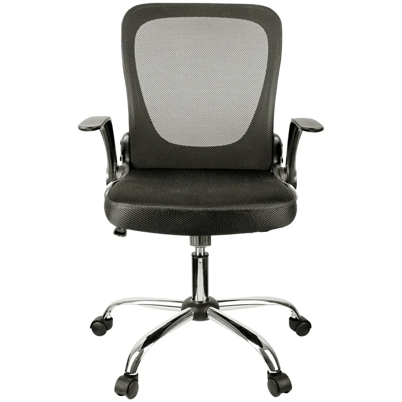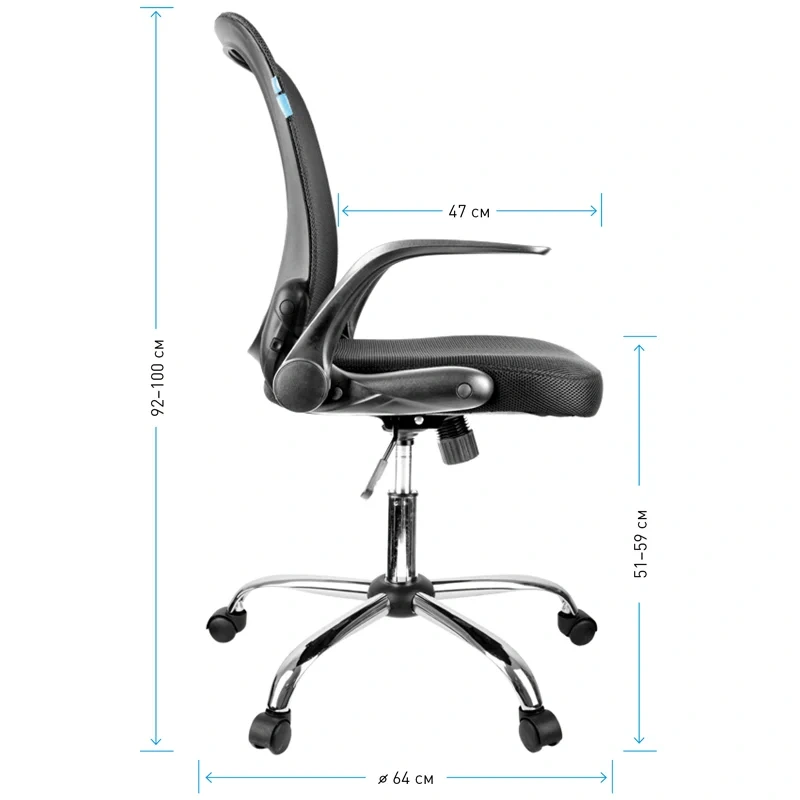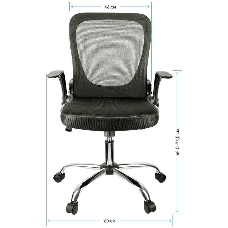 Компьютерное офисное кресло оператора Helmi HL-M04 Active – примечательная модель с хромированными элементами и откидными подлокотниками, особенно удобными в условиях ограниченного пространства. На выбор доступны два цвета обивки: полностью черный и черно-синий.