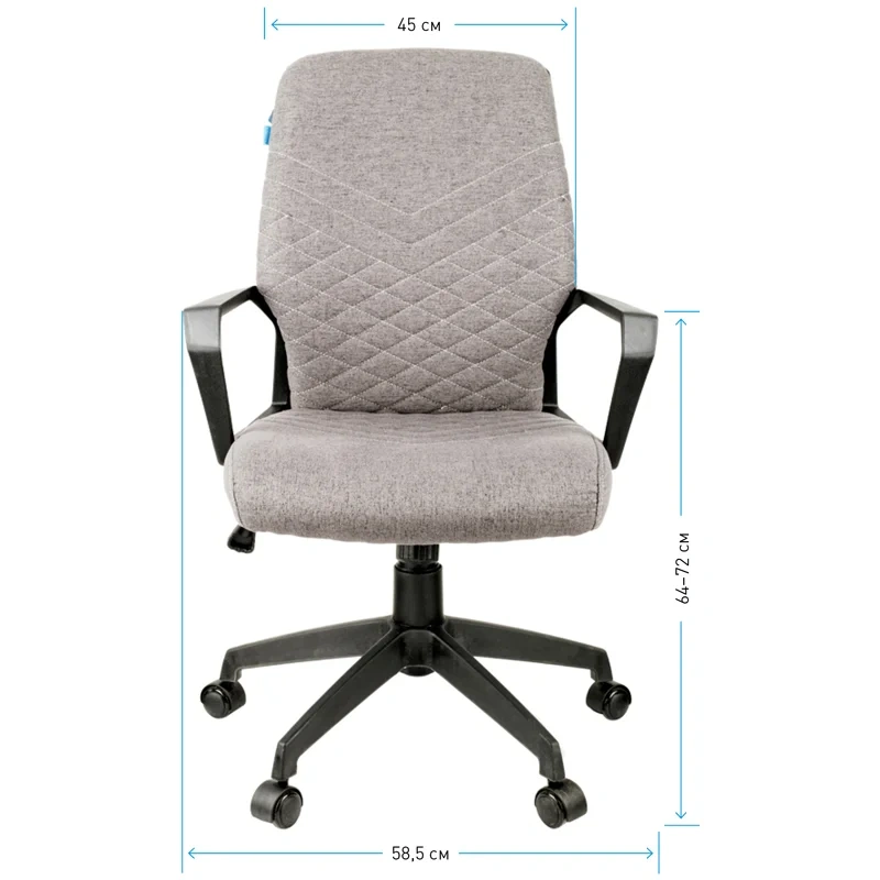 Максимальная нагрузка – 120 кг. Газпатрон 3 класса по стандарту BIFMA X5.1. Каркас – немонолитный, материал набивки – вспененный полиуретан, крестовина – чёрный пластик, материал обивки – ткань серого цвета. Механизм качания с возможностью фиксации кресла в рабочем положении. Гарантийный срок – 12 месяцев.