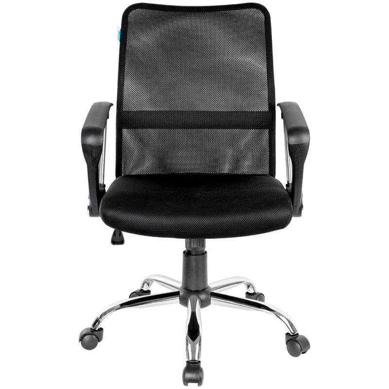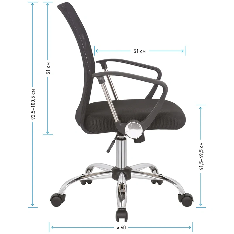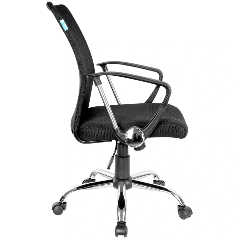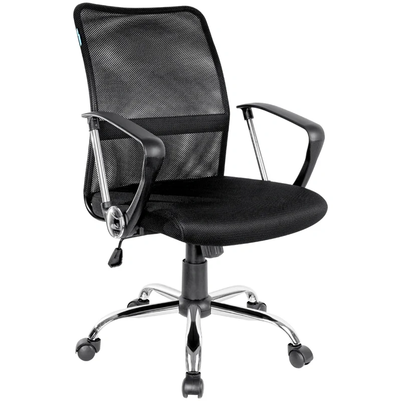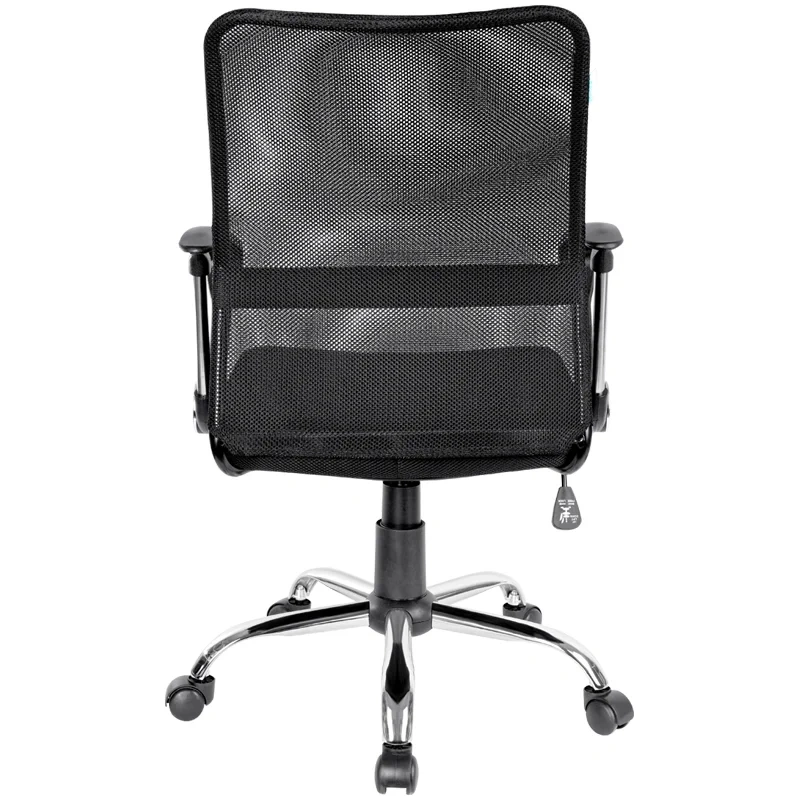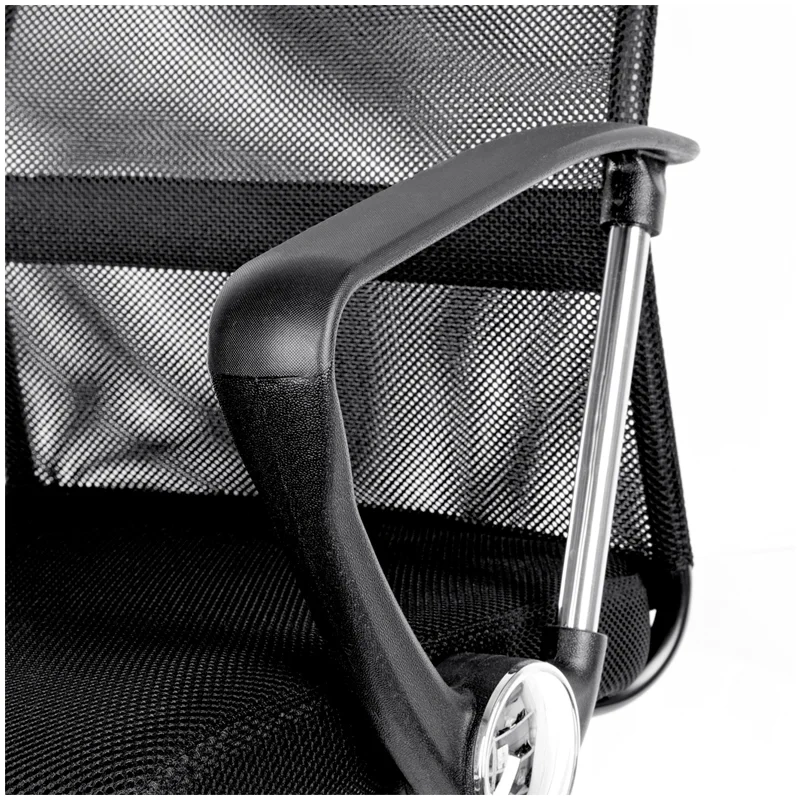 Максимальная нагрузка – 120 кг. Газпатрон 2 класс по стандарту BIFMA X5.1. Каркас – немонолитный, материал набивки – вспененный полиуретан, крестовина – хромированный металл, подлокотники пластиковые с хромированными элементами, материал обивки – ткань/сетка чёрного цвета. Механизм качания с возможностью фиксации кресла в рабочем положении. Гарантийный срок – 12 месяцев.