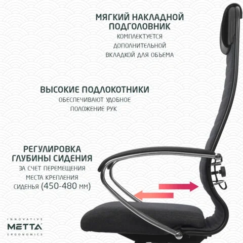 Спинка мягкая высокая, эргономичной формы с ярко выраженной поясничной поддержкой. Эргогиб, как у кресел SAMURAI.