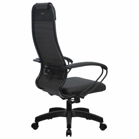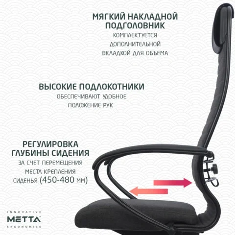 Спинка мягкая высокая, эргономичной формы с ярко выраженной поясничной поддержкой. Эргогиб, как у кресел SAMURAI.