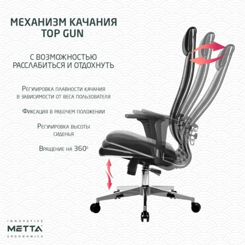 Модель оснащена механизмом качания 'Top-Gun' с регулировкой под вес и возможностью фиксации в рабочем положении.