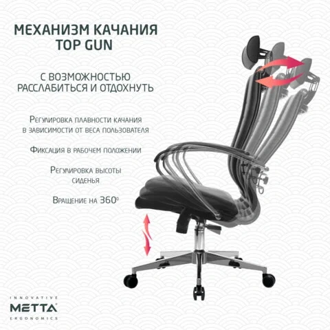 Модель оснащена механизмом качания 'Top-Gun' с регулировкой под вес и возможностью фиксации в рабочем положении.