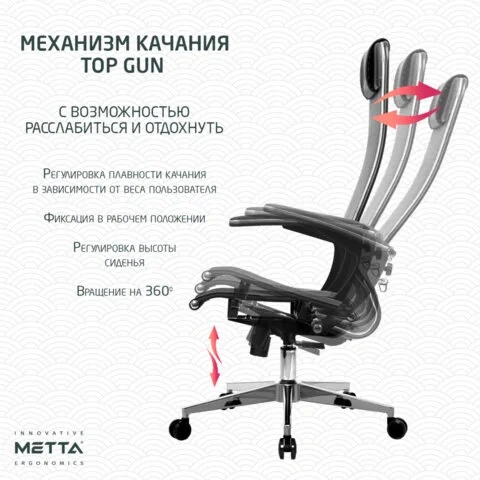 Модель оснащена механизмом качания 'Top-Gun' с регулировкой под вес и возможностью фиксации в рабочем положении.