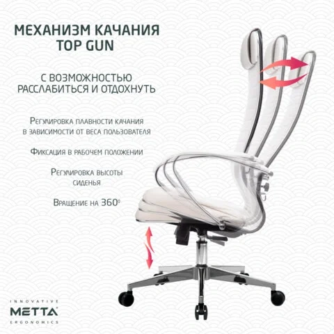 Модель оснащена механизмом качания 'Top-Gun' с регулировкой под вес и возможностью фиксации в рабочем положении.