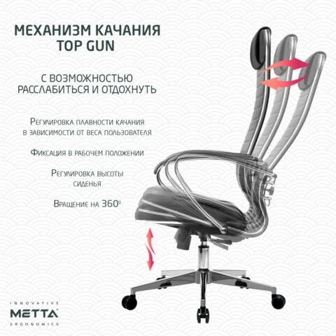 Модель оснащена механизмом качания 'Top-Gun' с регулировкой под вес и возможностью фиксации в рабочем положении.