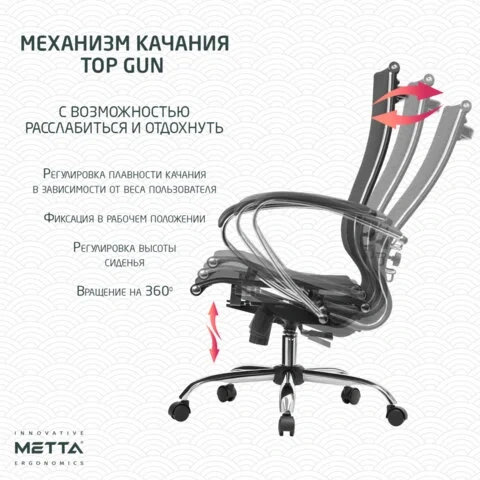 Модель оснащена механизмом качания 'Top-Gun' с регулировкой под вес и возможностью фиксации в рабочем положении.