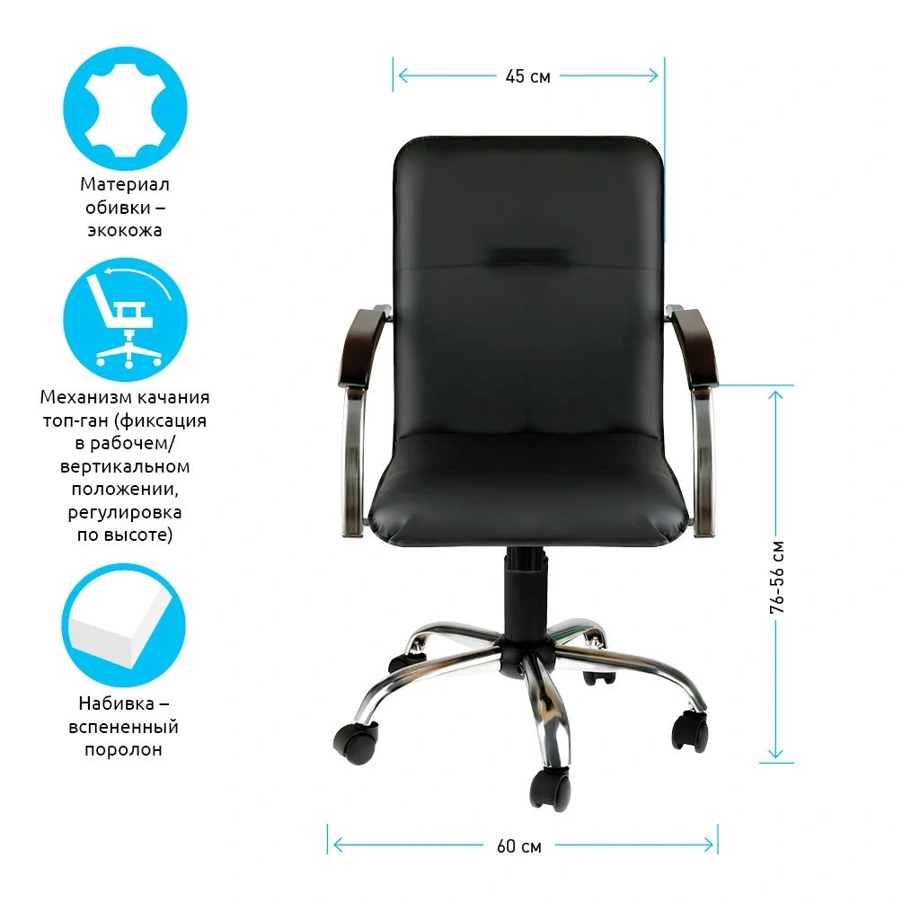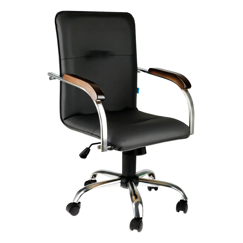 Кресло Самба выглядит строго и солидно. Такое впечатление создается благодаря использованию хромированного металла при лаконичном дизайне с ненавязчивыми формами — отсутствие массивного наполнителя и короткая спинка образуют легкий и изящный внешний вид. Рассчитана специально для ежедневных интенсивных нагрузок. Набивка - высокоупругий эластичный поролон. Подлокотники с деревянными накладками классического цвета 'орех' добавляют особого лоска офисному креслу. В связи с компактными размерами, кресло подойдет для людей невысокого роста. Поставляются по 1 штуке в коробке.