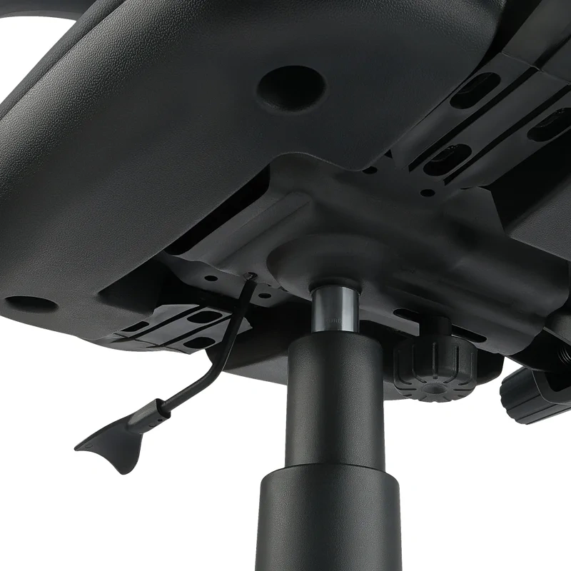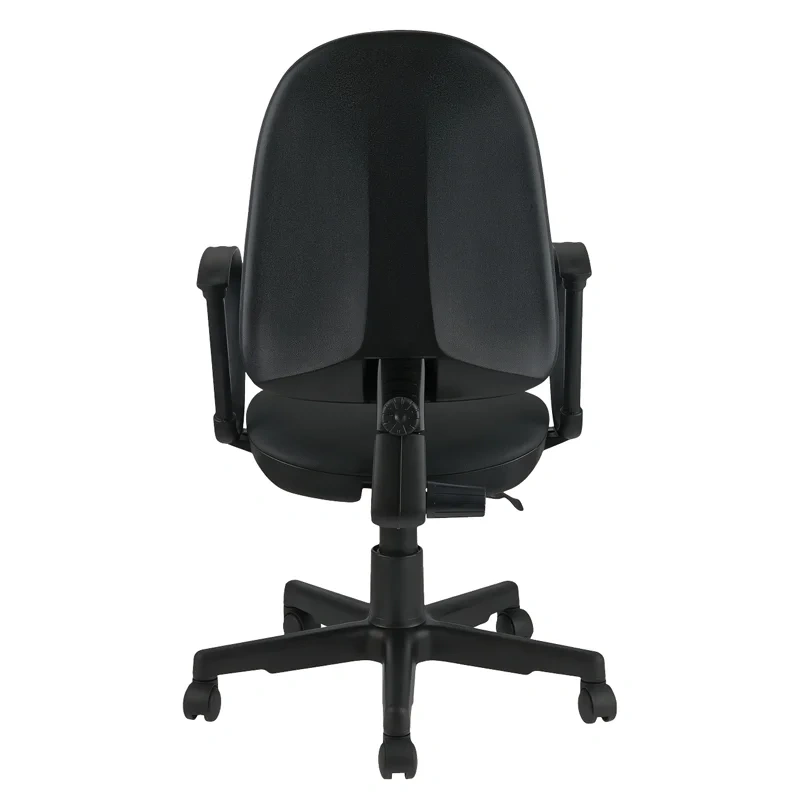 Максимальная нагрузка – 100 кг. Газпатрон 2 категории. Каркас – немонолитный, материал набивки – поролон, крестовина – пластик, материал обивки – чёрная экокожа. Механизм регулировки кресла по высоте, со свободным ходом отклонения спинки кресла и регулировкой жесткости, но без какой-либо фиксации.