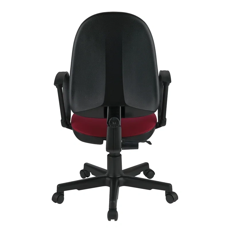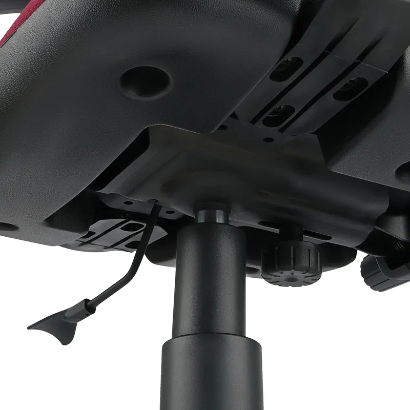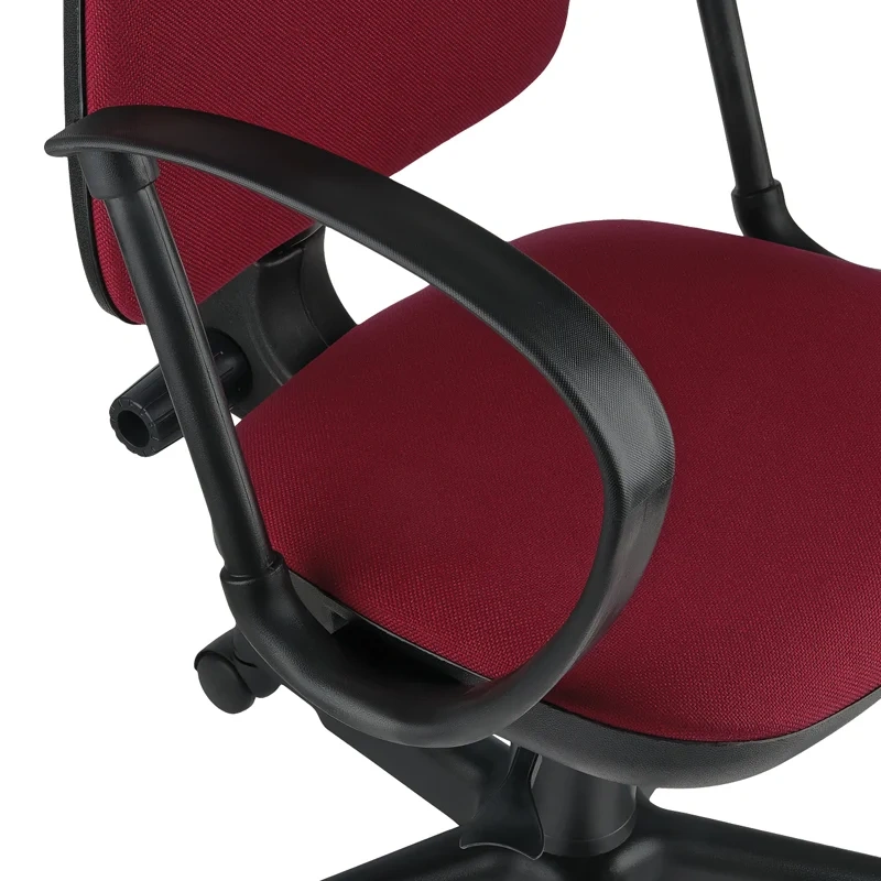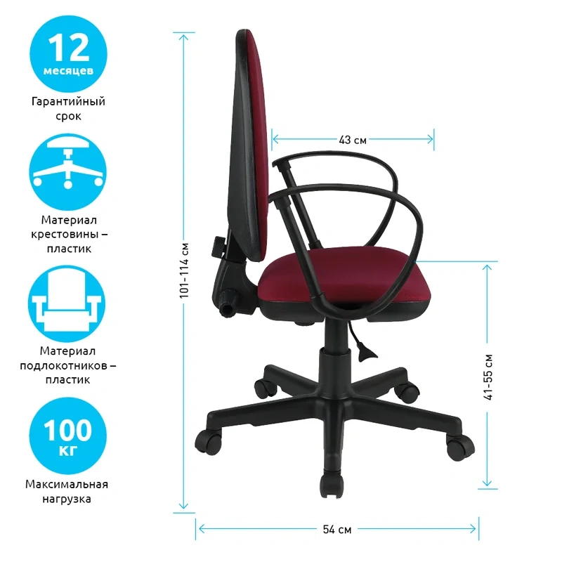 Максимальная нагрузка – 100 кг. Газпатрон 2 категории. Каркас – немонолитный, материал набивки – поролон, крестовина – пластик, материал обивки – ткань бордового цвета. Механизм регулировки кресла по высоте, со свободным ходом отклонения спинки кресла и регулировкой жесткости, но без какой-либо фиксации.