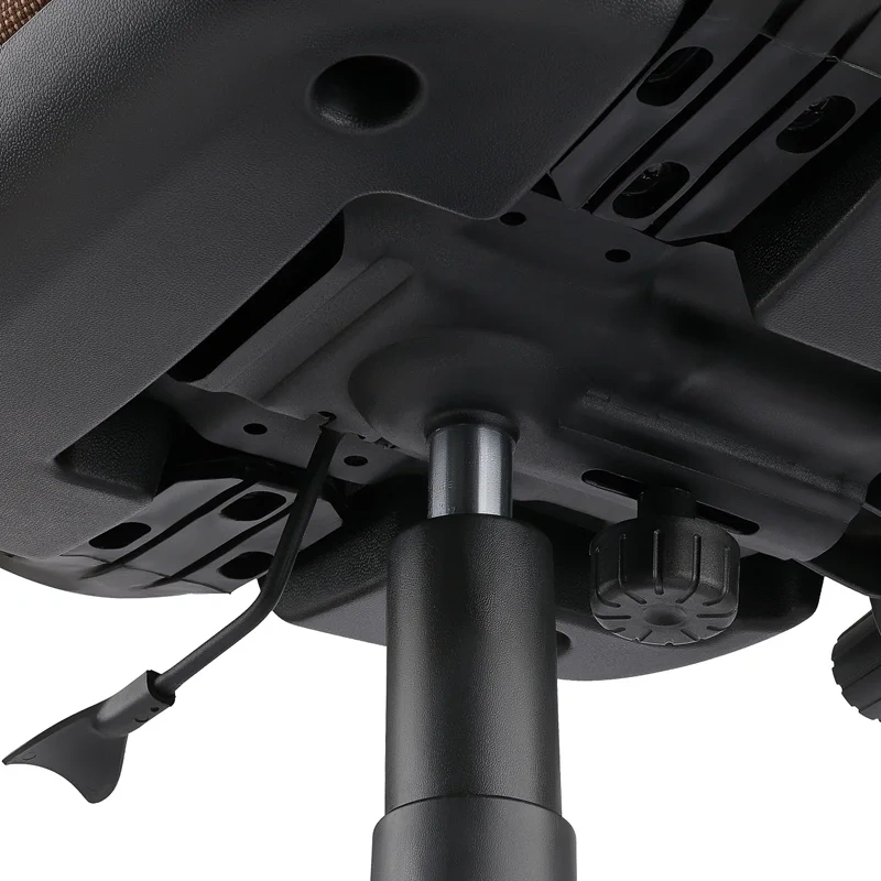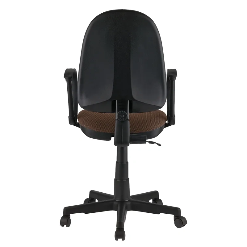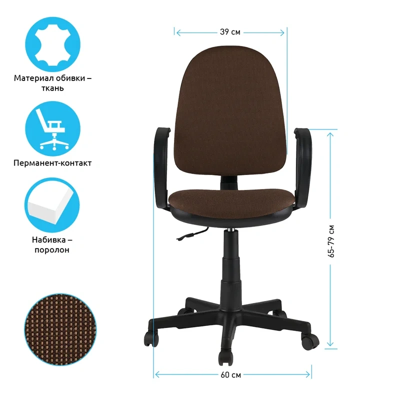 Максимальная нагрузка – 100 кг. Газпатрон 2 категории. Каркас – немонолитный, материал набивки – поролон, крестовина – пластик, материал обивки – ткань коричнево-бежевого цвета. Механизм регулировки кресла по высоте, со свободным ходом отклонения спинки кресла и регулировкой жесткости, но без какой-либо фиксации.