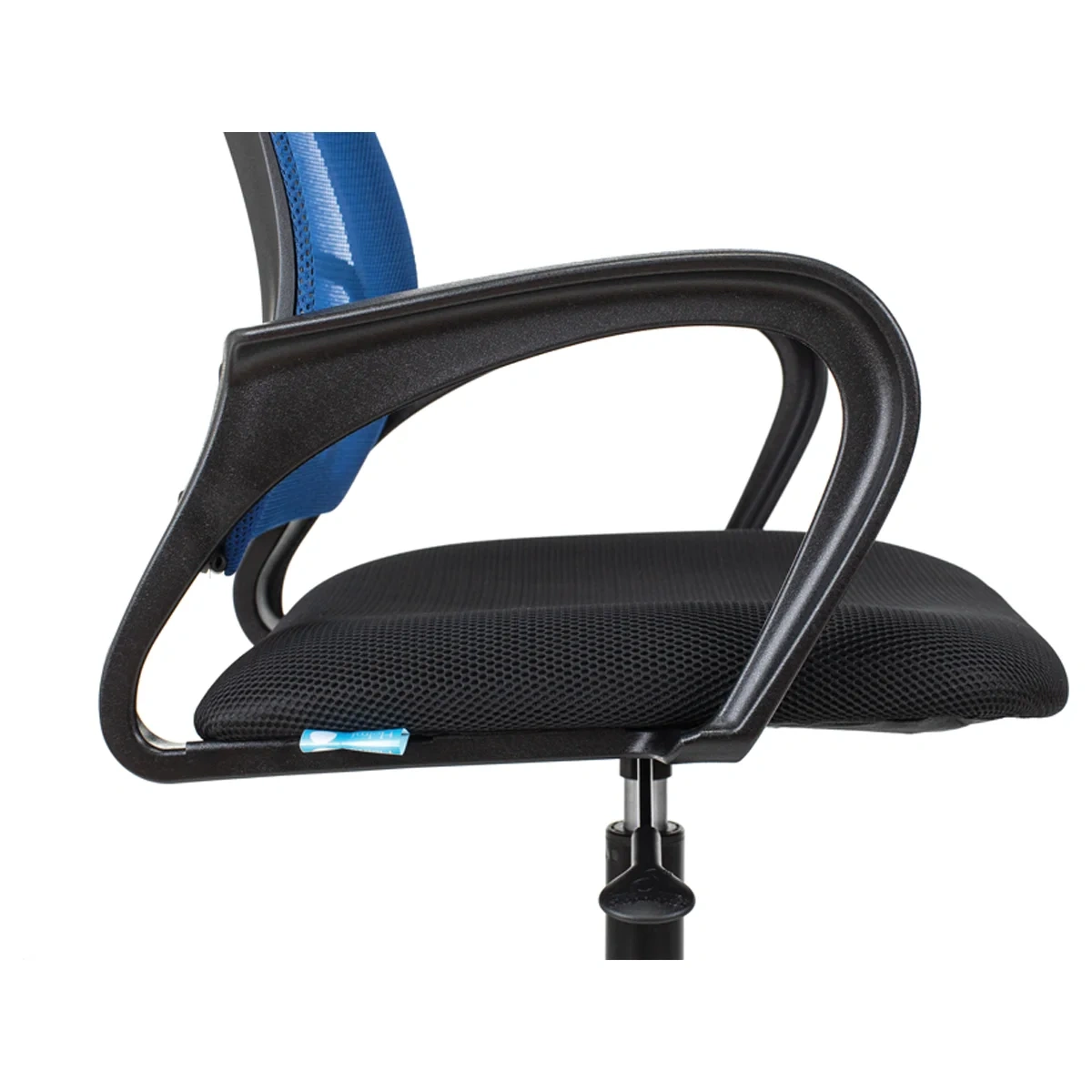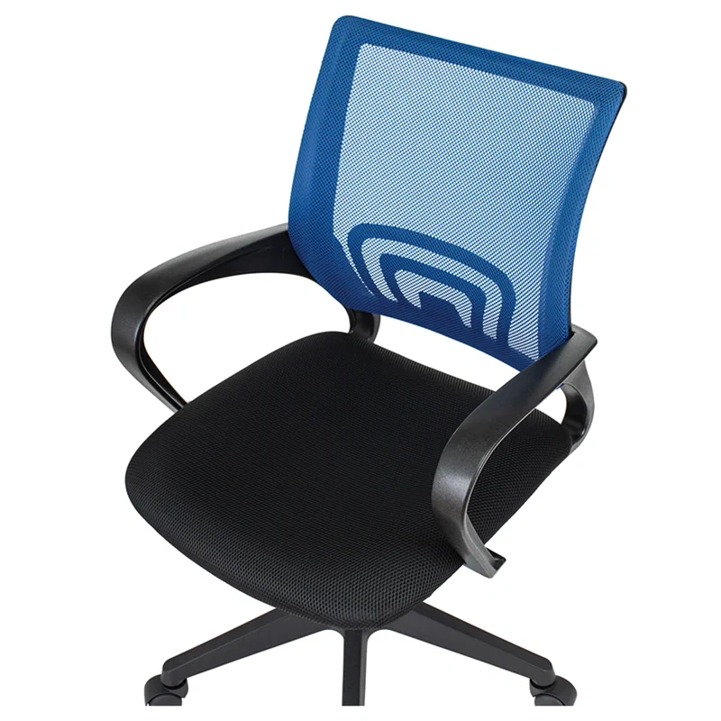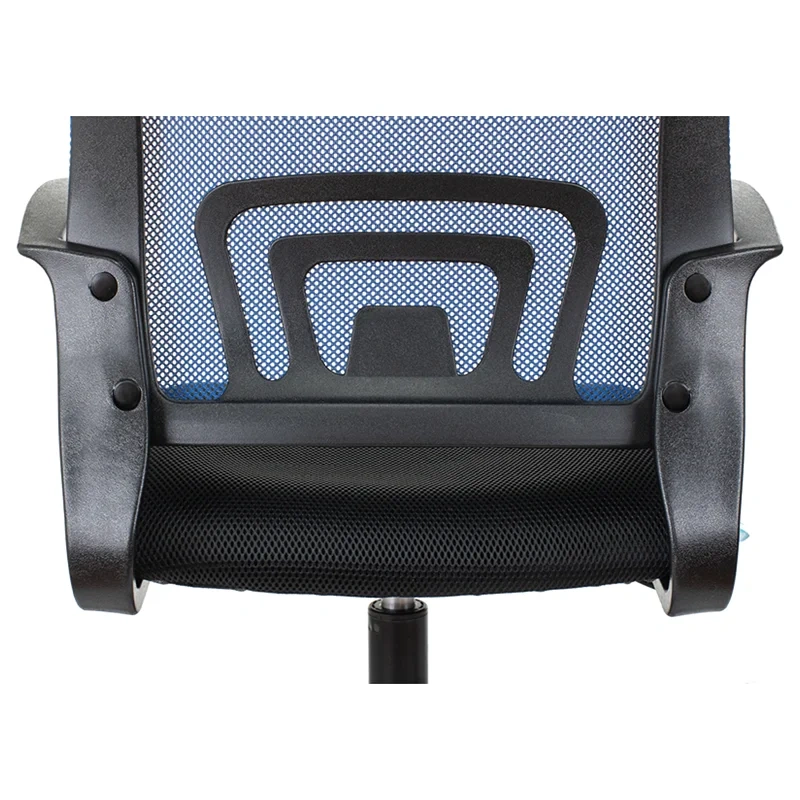 Максимальная нагрузка составляет 120 кг. Газпатрон 2 класса по стандарту Germany DIN 4550. Каркас – немонолитный, материал набивки – поролон, крестовина – пластиковая, подлокотники тоже изготовлены из пластика. Спинка из сетчатого акрила синего цвета подстраивается под физиологические изгибы спины. Сиденье выполнено из ткани чёрного цвета. Без механизма качания. Регулировка кресла по высоте. Гарантийный срок – 3 года. Кресло поставляется в картонной коробке в разобранном виде.
