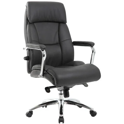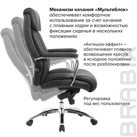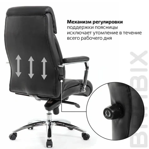 Стильные хромированные элементы, увеличенные размеры сиденья и спинки, а также особый механизм регулировки поддержки поясницы исключают утомление в течение всего рабочего дня.