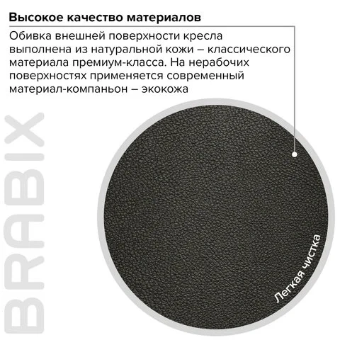 Обивка внешней поверхности кресла выполнена из натуральной кожи - классического материала премиум-класса. На нерабочих поверхностях применяется материал-компаньон - экокожа.