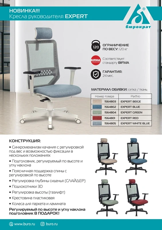 Кресло руководителя Бюрократ Expert сетка/ткань 38-405, серый/голубой, с подголовником, крестовина пластик