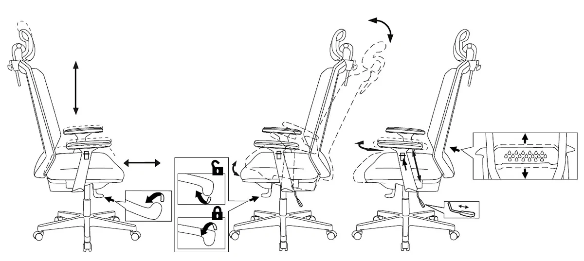 | Регулировка | высоты (газлифт), высоты подголовника, положения подлокотников, поясничной области, угла наклона под |