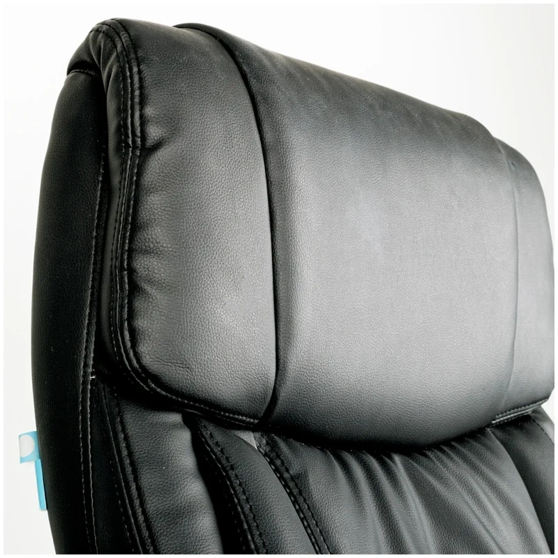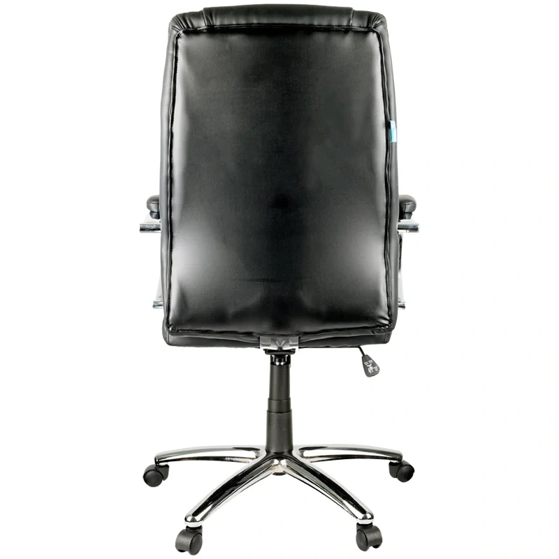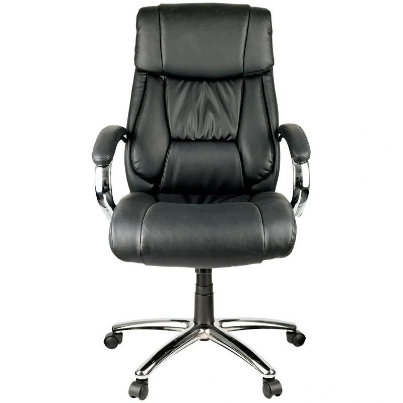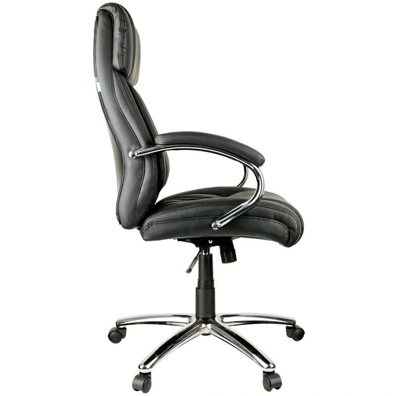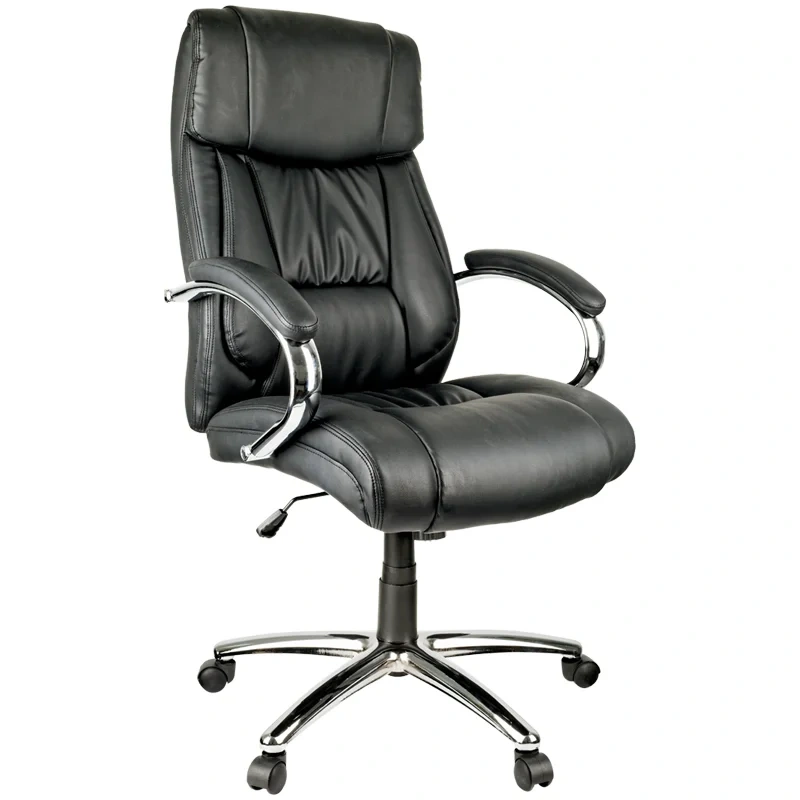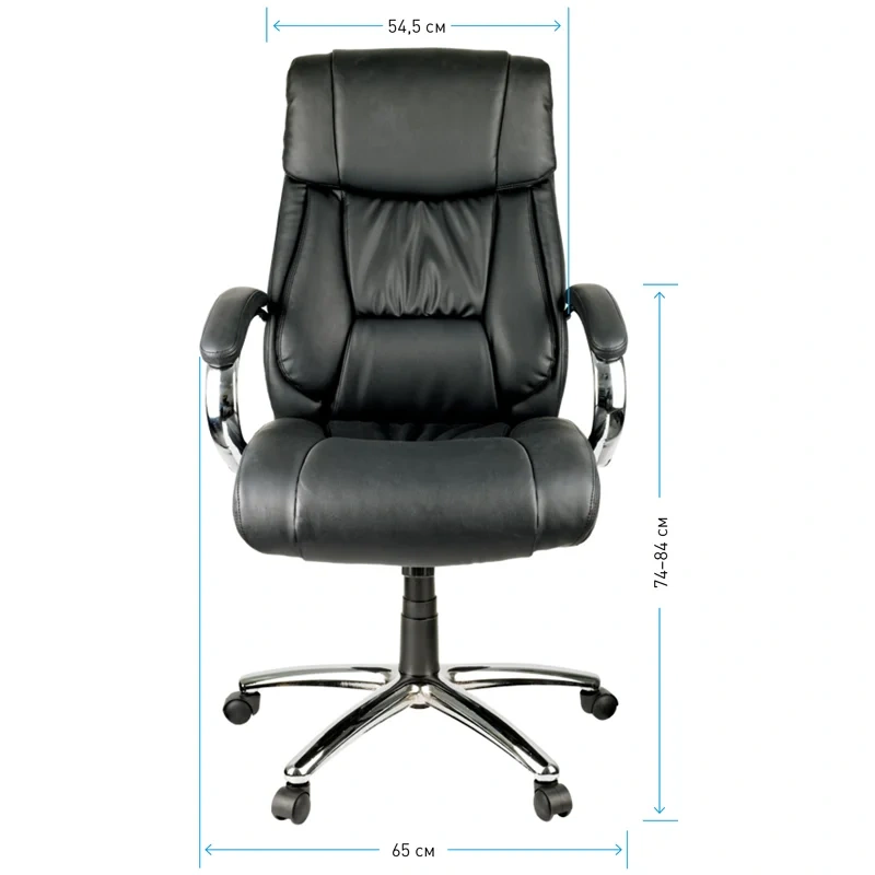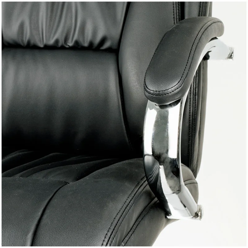 Максимальная нагрузка составляет 120 кг. Газпатрон 3 класса по стандарту BIFMA X5.1. Каркас – немонолитный, материал набивки – вспененный полиуретан, крестовина –хромированный металл, материал обивки – экокожа чёрного цвета. Модель имеет хромированные металлические подлокотники с накладками из экокожи. Механизм качания с возможностью фиксации кресла в рабочем положении. Гарантийный срок – 12 месяцев.