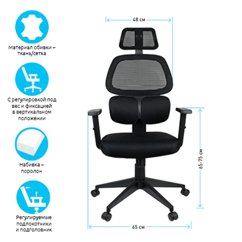 Максимальная нагрузка составляет 120 кг. Газпатрон 3 класс по стандарту BIFMA X5.1. Каркас – немонолитный, материал набивки – поролон, крестовина – пластик, подлокотники – пластиковые регулируемые, материал обивки –ткань/сетка. Механизм качания с регулировкой под вес и фиксацией в вертикальном положении. Гарантийный срок – 12 месяцев.