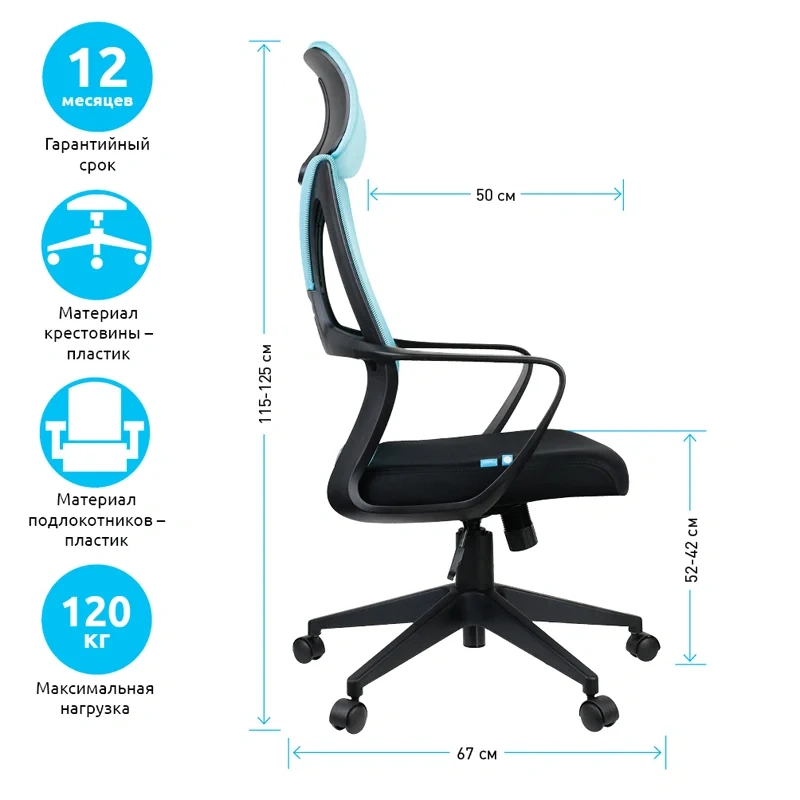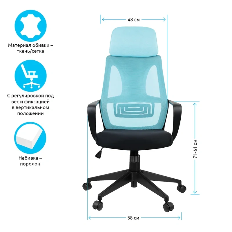 Максимальная нагрузка составляет 120 кг. Газпатрон 3 класс по стандарту BIFMA X5.1. Каркас – немонолитный, материал набивки – поролон, крестовина – пластик, подлокотники – пластиковые, материал обивки –ткань/сетка. Механизм качания с регулировкой под вес и фиксацией в вертикальном положении. Гарантийный срок – 12 месяцев.