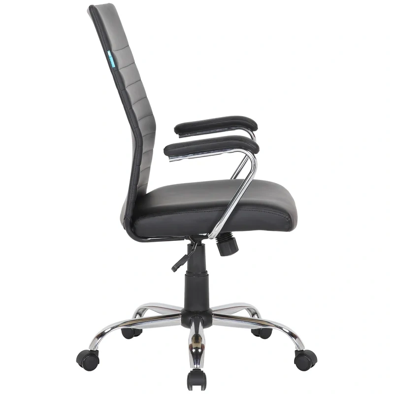 Кресло руководителя классического стиля - на металлическом каркасе с хромированными элементами, отличительным дизайном подлокотников и горизонтальной отстрочкой на спинке.