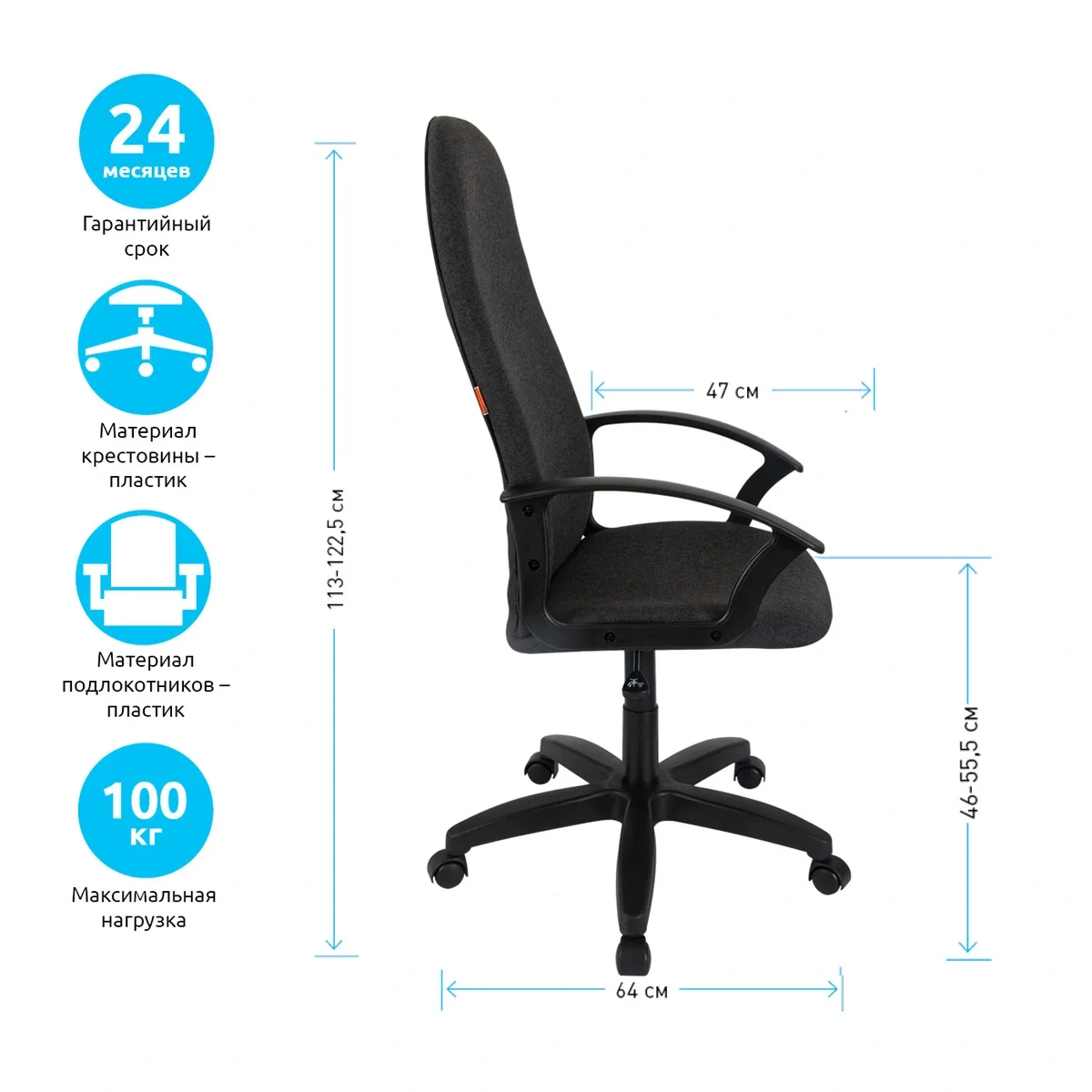 Максимальная нагрузка составляет 100 кг. Газпатрон 2 категории по стандарту Germany DIN 4550. Каркас – немонолитный, материал набивки – вспененный полиуретан, крестовина – пластик, подлокотники – пластик, материал обивки – практичная и износостойкая ткань серого цвета. Регулировка по высоте позволяет настроить сиденье под конкретного пользователя. Гарантийный срок –24 месяца.