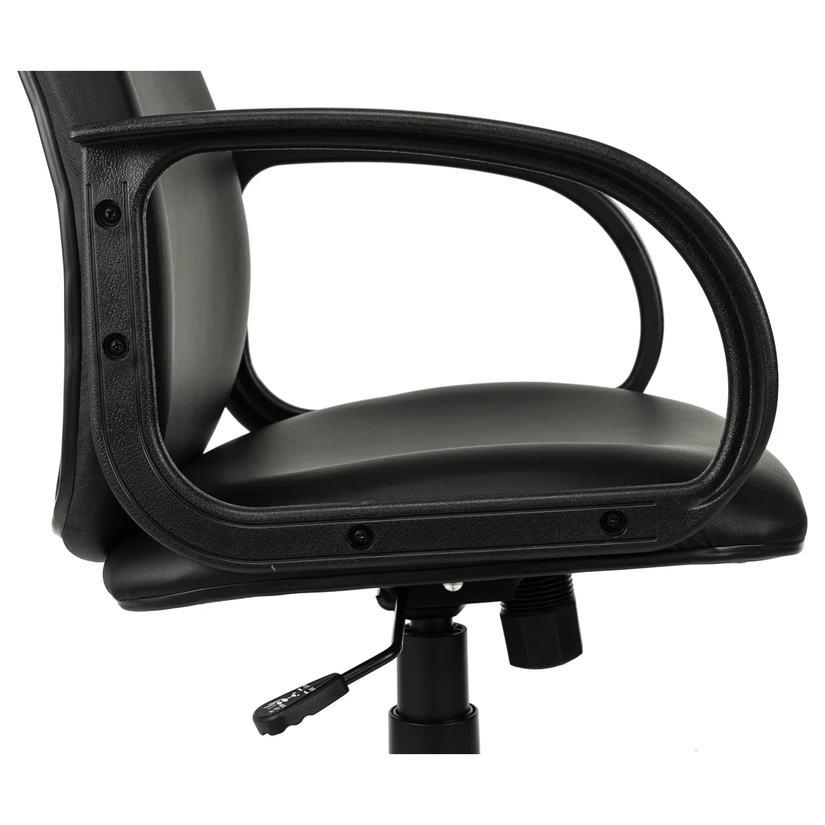 Максимальная нагрузка составляет 120 кг. Газпатрон 3 категории. Каркас – немонолитный, материал набивки – вспененный полиуретан, крестовина – пластик, подлокотники – пластик, материал обивки – экокожа чёрного цвета. Механизм качания с возможностью фиксации кресла в рабочем положении, регулировка кресла по высоте под рост пользователя. Гарантийный срок – 24 месяца.