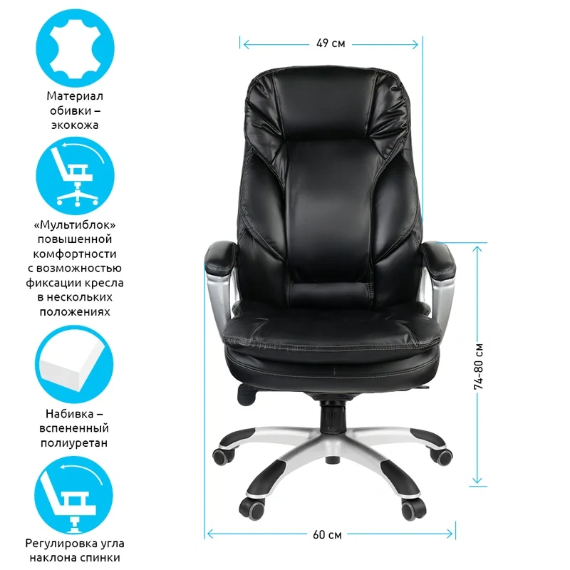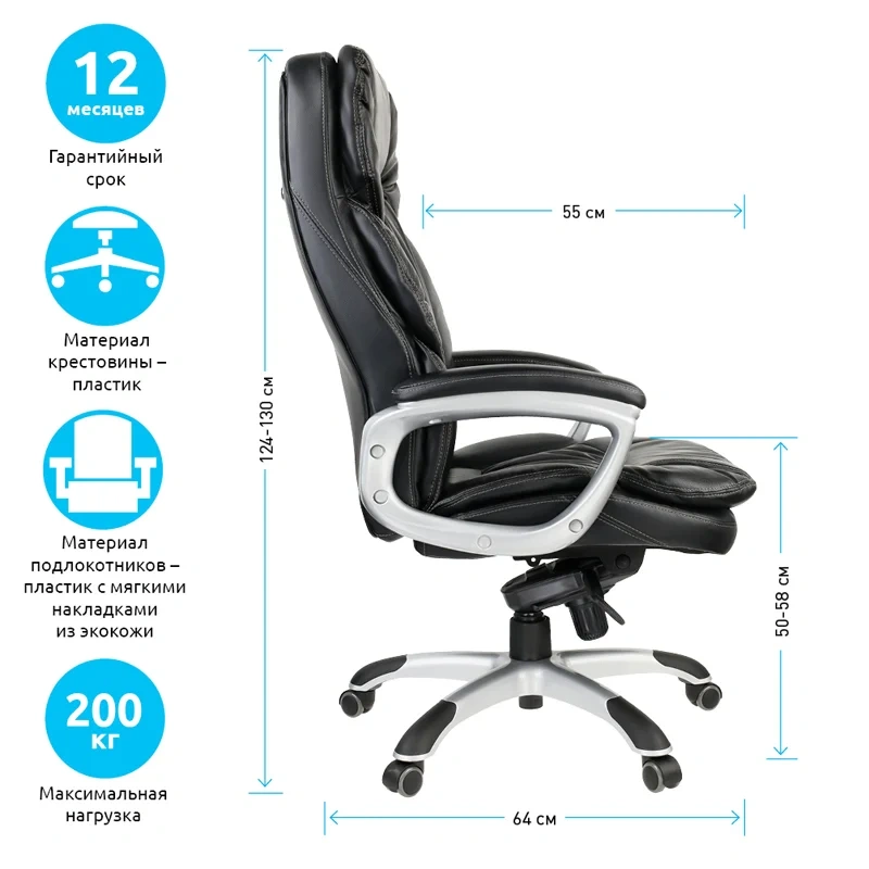 Каркас – немонолитный, материал набивки – вспененный полиуретан, крестовина – пластик, материал обивки – экокожа чёрного цвета. Модель имеет пластиковые крашеные подлокотники с мягкими накладками из кожи. Газпатрон 4 категории по стандарту Germany DIN 4550.