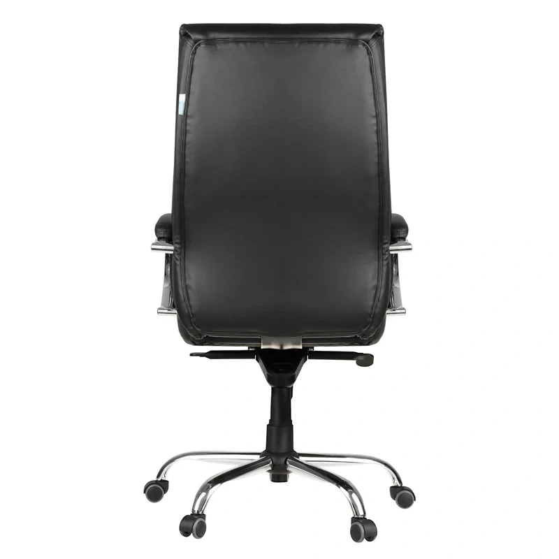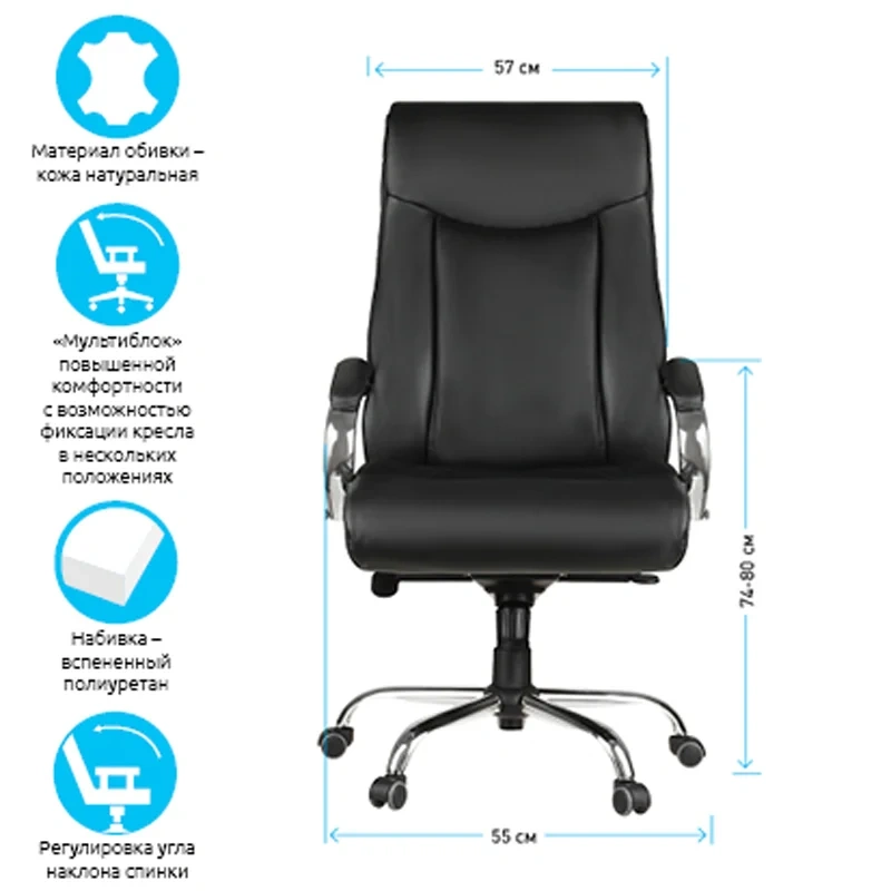 Каркас – немонолитный, материал набивки – вспененный полиуретан, крестовина – металл, материал обивки – натуральная кожа чёрного цвета. Модель имеет металлические хромированные подлокотники с накладками из экокожи. Газпатрон 4 категории по стандарту Germany DIN 4550.