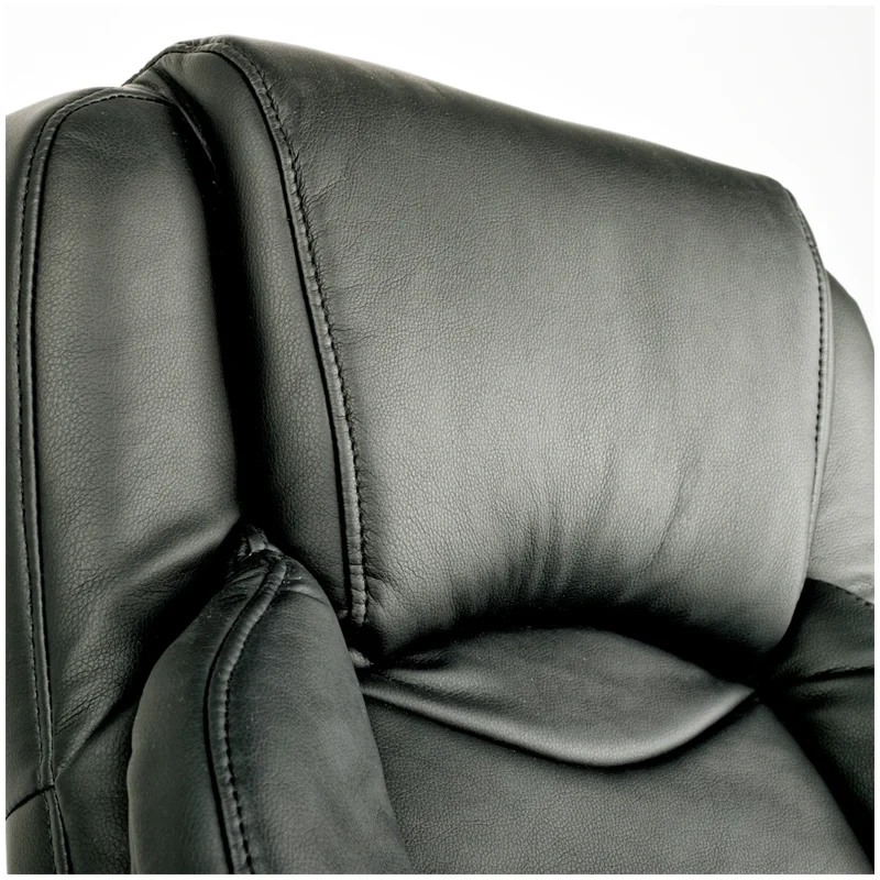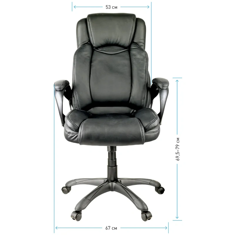Максимальная нагрузка составляет 120 кг. Газпатрон 3 класса по стандарту BIFMA X5.1. Каркас – немонолитный, материал набивки – вспененный полиуретан, крестовина –пластик, материал обивки – экокожа чёрного цвета. Модель имеет пластиковые подлокотники с накладками из экокожи. Механизм качания с возможностью фиксации кресла в рабочем положении. Гарантийный срок – 12 месяцев.