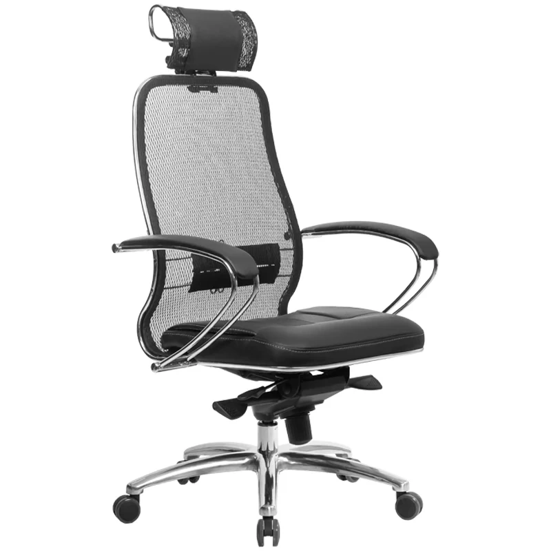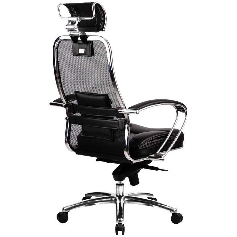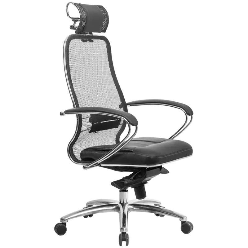 Укороченная спинка со съёмным 3D подголовником. Каркас кресла: цельный стальной, покрытый зеркальным хромом; Подлокотники: износостойкие из натуральной кожи; Подголовник: износостойкий из натуральной кожи; Варианты обивки: сетчатая ткань, армированная высокопрочным арамидным волокном, сиденье из натуральной перфорированной кожи NewLeather; Пятилучье: стальное литое, покрытое зеркальным хромом; Механизм качания: 'Мультиблок'; Ролики: полиуретановые; Рекомендуемая максимальная нагрузка: 150 кг. Произведена замена модификации .03 на .04 (поясничный подпор 2D). Наличие в одной поставке кресел с разными модификациями не является основанием для обмена и возврата продукции.