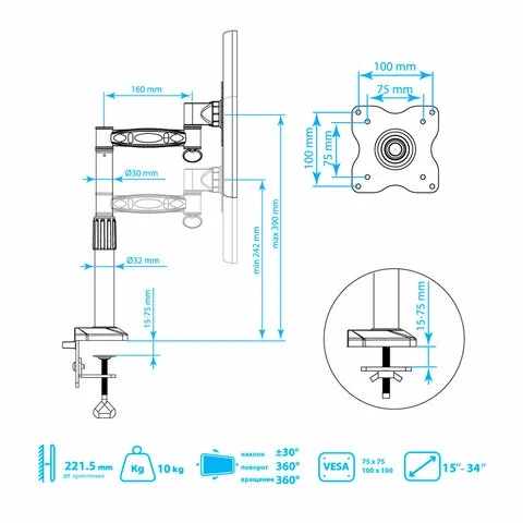 Кронштейн для монитора крепится за край рабочего стола с помощью мощной струбцины. Высота кронштейна настраивается с помощью телескопической штанги (от 220-368 мм). Для экрана 13-24 дюймов максимальная нагрузка -10 кг. Кронштейн дает возможность работать перед монитором как в обычном, так и в 'портретном' режиме.