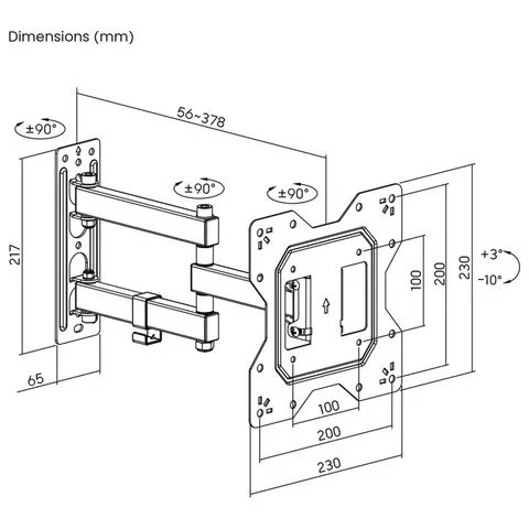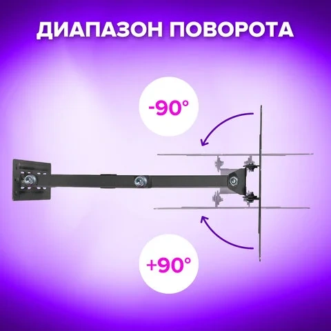 Поворотно-наклонная конструкция кронштейна обладает широкими возможностями регулировки: позволяет наклонять экран на 3° вверх и 10° вниз, поворачивать на 90° вправо и влево, выдвигать от стены на расстояние 56 - 378 мм. Все это поможет Вам подобрать оптимальный угол обзора для вашего комфорта.