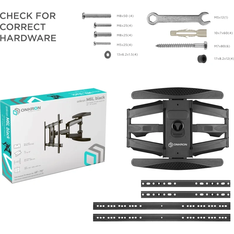 Ультратонкий настенный кронштейн для телевизоров Onkron M6L имеет двойную конструкцию, что обеспечивает максимум надежности и функционала. Поддерживаются все современные телевизоры с диагональю от 40 до 70 дюймов с универсальным креплением VESA 200?100 — 600?400 мм, и нестандартные соотношения VESA. Стальная конструкция прошла тестирование тройной нагрузкой и прекрасно справится с телевизорами весом до 45.5 кг.