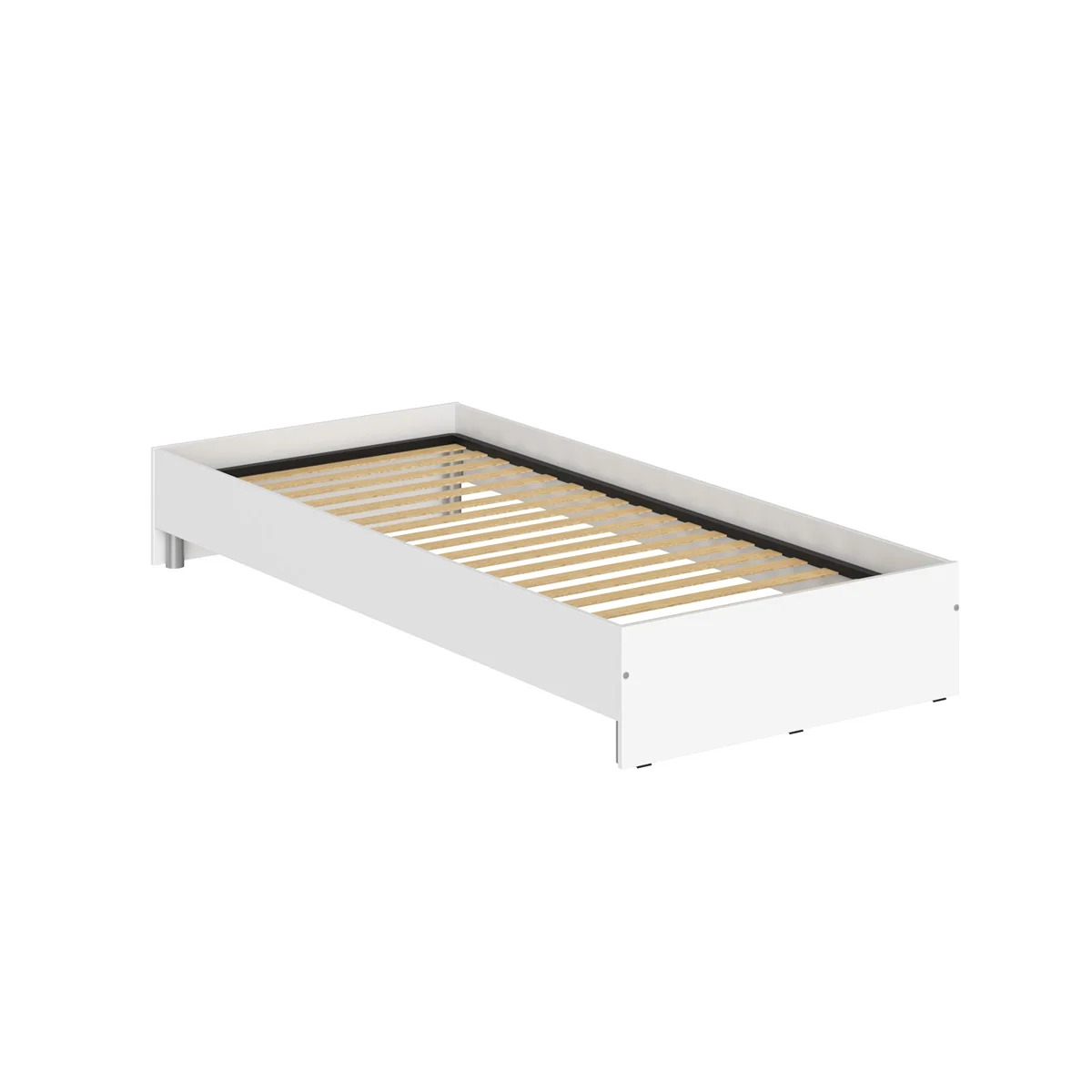 Компактная кровать без изголовья KANN для использования в гостинице или дома, размеры кровати – 940х2040х300 мм, размер спального места - 900х2000, цвет - Белый. Кровать выполнена из ЛДСП, что придает ей прочность и надежность. Конструкция оснащена прочными силовыми креплениями – эксцентриковыми стяжками. Все торцы основных элементов кровати надежно защищены кромкой ПВХ – 2 мм. Регулируемые по высоте опоры обеспечат устойчивость на неровном полу.