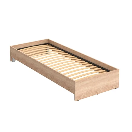 Компактная кровать без изголовья KANN для использования в гостинице или дома, размеры кровати – 840х2040х300 мм, размер спального места - 800х2000, цвет - Дуб Сонома Светлый. Кровать выполнена из ЛДСП, что придает ей прочность и надежность. Конструкция оснащена прочными силовыми креплениями – эксцентриковыми стяжками. Все торцы основных элементов кровати надежно защищены кромкой ПВХ – 2 мм. Регулируемые по высоте опоры обеспечат устойчивость на неровном полу.