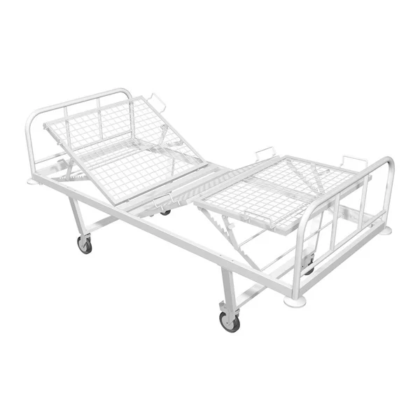 Кровать имеет три секции, а также оснащена колесами для перемещения по больнице. Каркас изготовлен из металла.