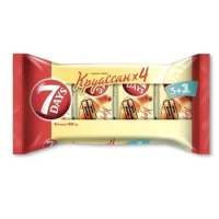 Круассан 7 days с кремом Какао 65 г промоупаковка, 3+1 штука - это четыре порции сладкой, вкусной и питательной выпечки с мягким вкусом вареной сгущенки. Нежное, воздушное тесто в сочетании с начинкой создает приятное ощущение и подходит для любого времени дня. Благодаря отдельной упаковке каждый круассан удобно брать с собой, что делает его подходящим для перекусов на работе, в школе, во время поездок или прогулок с детьми.