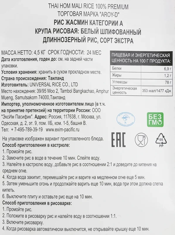 Крупа рис Aroy-D Жасмин Тайский категории А, 4.5кг