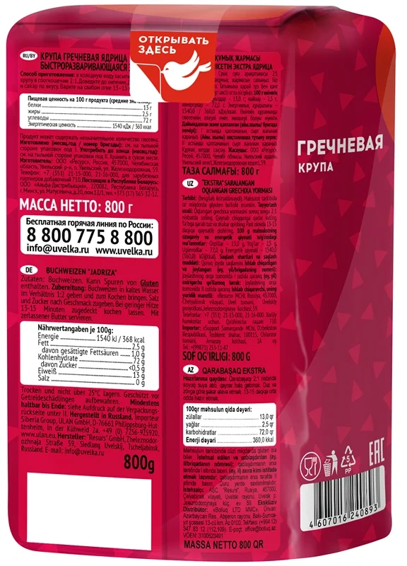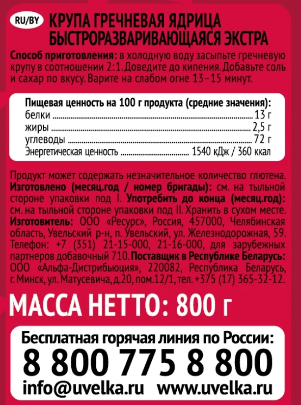 Крупа гречневая Увелка ядрица, 800г