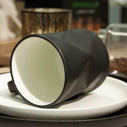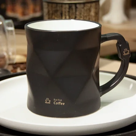 Выполнена изфарфора. Она имеет лаконичный дизайн в чёрной гамме, который подойдёт для любого интерьера. Кружка может использоваться как для горячих, так и для холодных напитков.